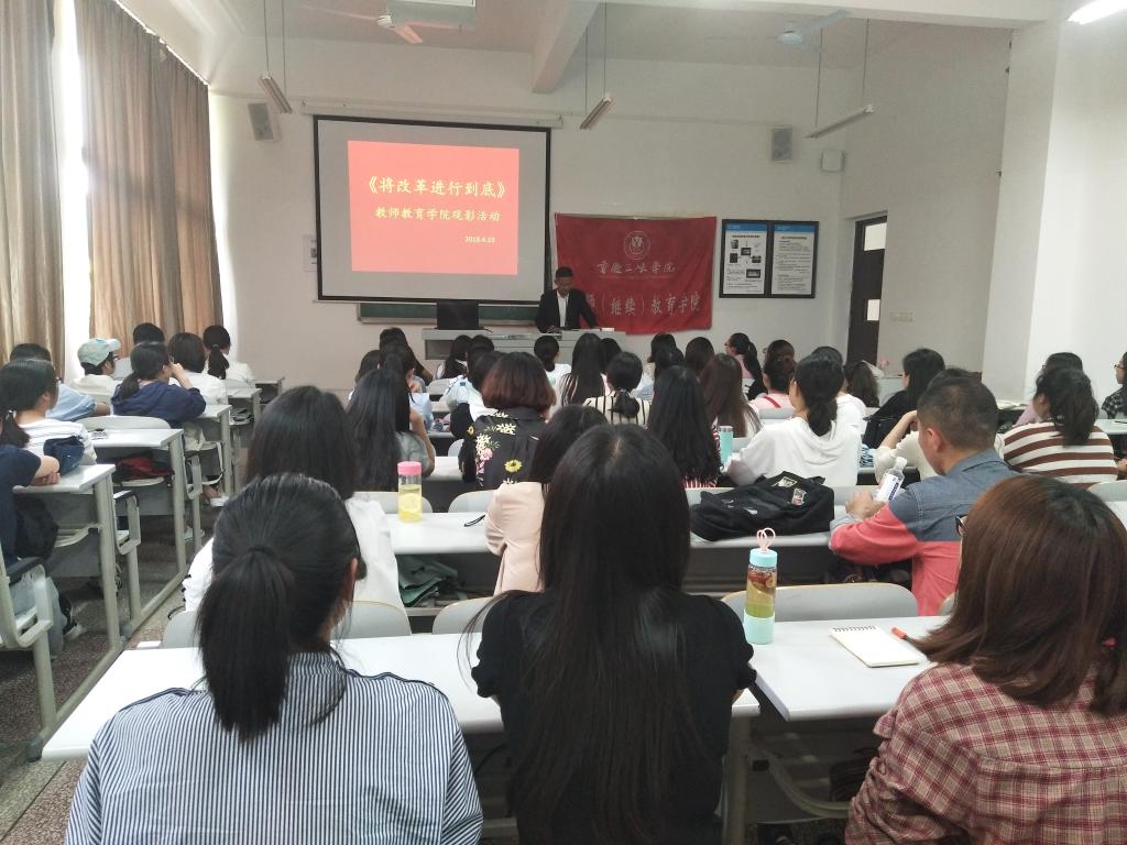 为进一步学习贯彻习近平新时代中国特色社会主义思想和党的十九大精神,让广大青年学子进一步了解党的十八大以来现代化建设的伟大成就,2018年4月19日,437bwin必赢国际组织全体员工党员、预备党员、积极分子和部分先进团员代表在3教104教室观看专题片《将改革进行到底》之《时代之问》。公司党总支书记潘勇、员工第一、第二党支部书记高曼、张京友以及辅导员冯梅也参加了此次观影活动。