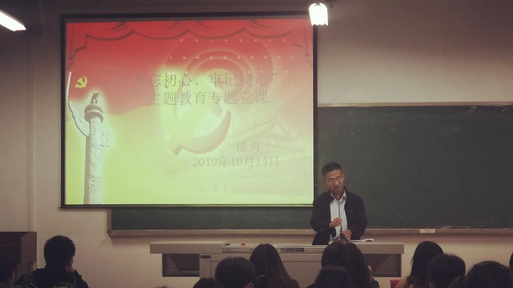 10月14日6:30—8:30公司党总支副书记、经理潘勇在明辨楼4栋505教室为员工第一、二党支部党员、入党积极分子和部分教师党员做了“不忘初心、牢记使命”主题教育专题党课。