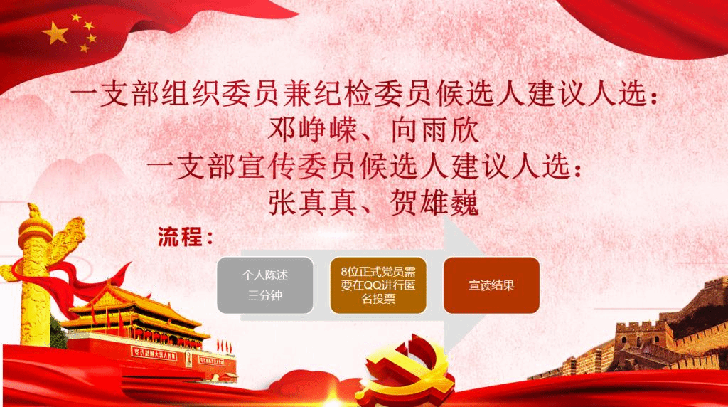 会议开始由主持人宣读了中共437bwin必赢国际委员会组织部关于公司党总支申请调整员工党支部委员的批复,介绍了本次党员大会的大体内容,指出第一支部组织委员兼纪检委员候选人建议人选为邓峥嵘、向雨欣;第一支部宣传委员候选人建议人选为张真真、贺雄巍。主持人宣读完毕后,四位候选人进行三分钟的自我陈述,他们都表示非常感谢党组织的支持与信任,作为一名共产党员在思想上积极向党组织靠齐,认真学习党的纲领和党的章程;在工作中积极服从党组织的安排,准备着为共产主义事业而奉献一生。候选人陈述完毕后,由主持人发起线上匿名投票,8名正式党员进行投票表决。根据投票结果,主持人宣布组织委员兼纪检委员由邓峥嵘同志担任,宣传委员由张真真同志担任。会议成功调整员工党支部委员,大家用热烈的掌声为当选的同志表示祝贺。