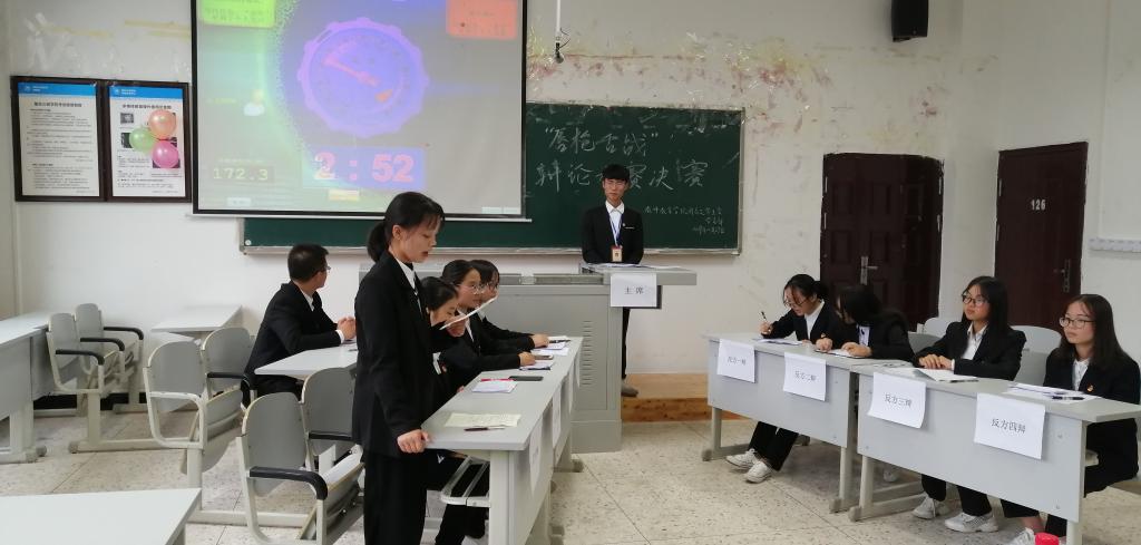 本次活动的主题是“唇枪舌战”,本次比赛共有正反方两组参赛选手。正反方选手依次入座,准备辩论,主持人介绍评委并宣布比赛规则。决赛分为正反方的自我介绍,开篇立论,驳立论阶段等六个环节。比赛过程中,双方辩手妙语连珠,引经据典,敏捷的思维,自信的风范给同学们留下深刻的印象,赢得观众阵阵掌声。攻辩环节,正反方选手互不相让,争锋相对,现场紧张的气氛再度升温。比赛接近尾声,评委为比赛做出精彩点评,指出选手们的优点和不足。经过最终评选,主持人公布获胜结果,由活动嘉宾为获胜选手颁发奖状。