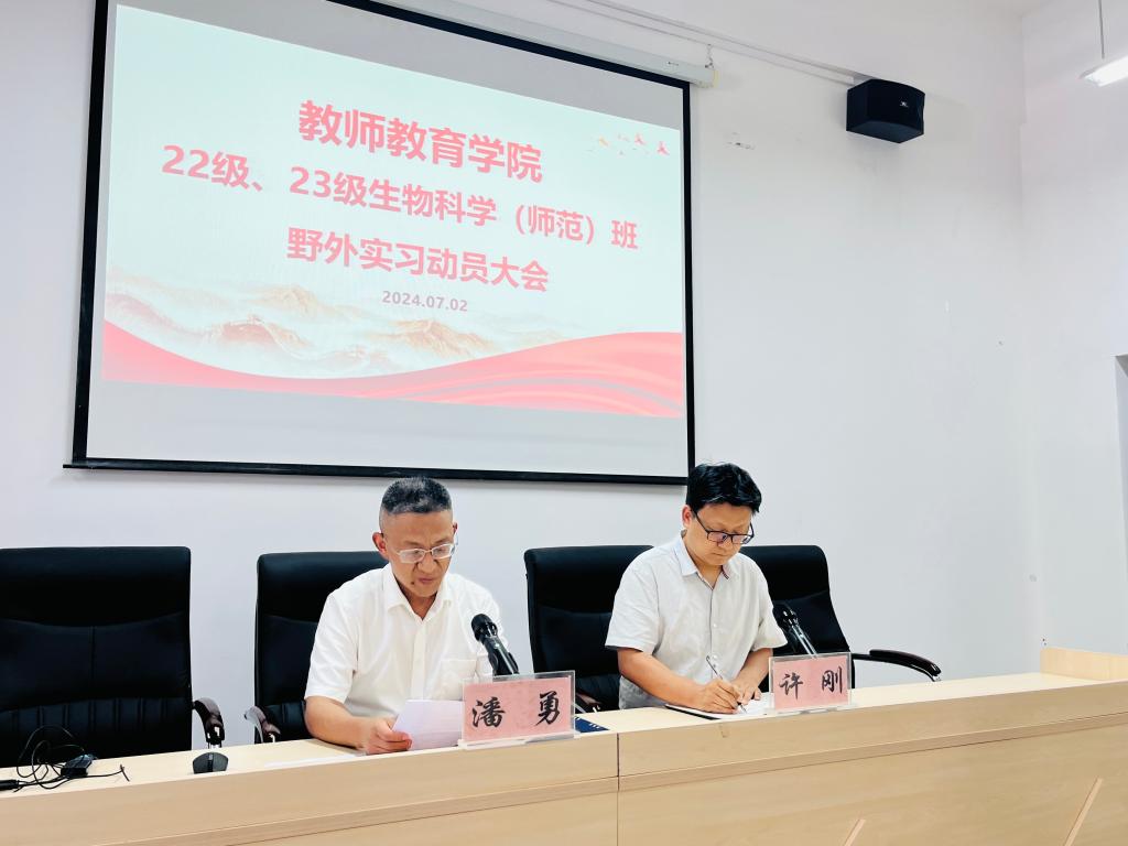 2024年7月2日,437bwin必赢国际在博学楼3栋138召开2022级、2023级生物科学(师范)班野外实习动员大会,经理潘勇、副经理许刚、系主任杨俊年、专业课老师沙爱龙、钟彦、辅导员冯梅、邓峥嵘及2022级、2023级生物科学(师范)班全体员工参会。大会由副经理许刚主持。