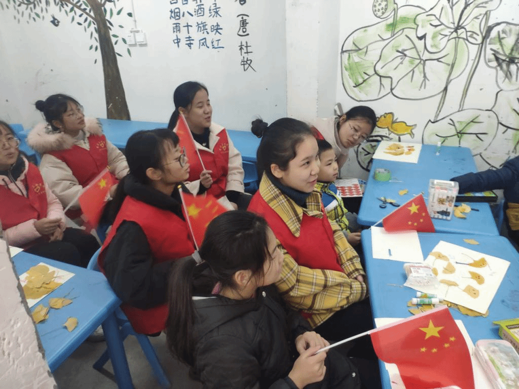 早上8点半,志愿者乘坐公交车到达活动场地,在教室门外等待活动开始。几分钟后,小朋友陆陆续续到达教室。活动开始后,首先进行的用银杏树叶作画的环节,志愿者们拿出准备好的素描纸和银杏树叶分给小朋友,小朋友将银杏树叶剪成各种形状,拼成小人,蝴蝶,大树等图案。随后志愿者教小朋友唱歌曲我和我的祖国,志愿者和小朋友脸上贴着心形的国旗,手中挥舞着小国旗,一同唱响爱国的歌曲。室内活动结束后,志愿者和小朋友们来到室外做贴膏药的小游戏,他们围成一个小圈,小朋友和志愿者你追我跑,温暖的阳光逐渐拉近了他们的距离。活动结束后小朋友都拿出自己的银杏画与志愿者拍照合影。