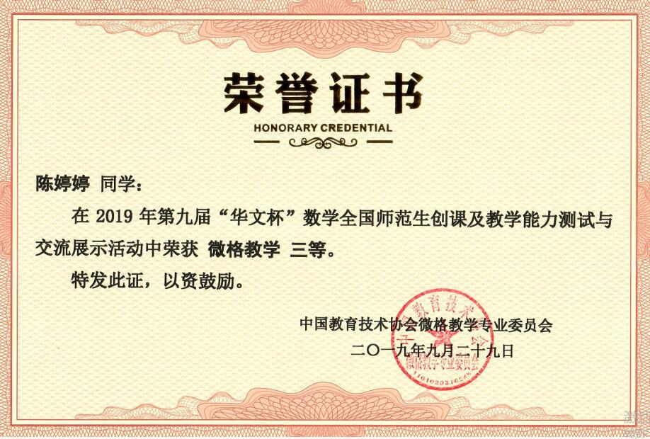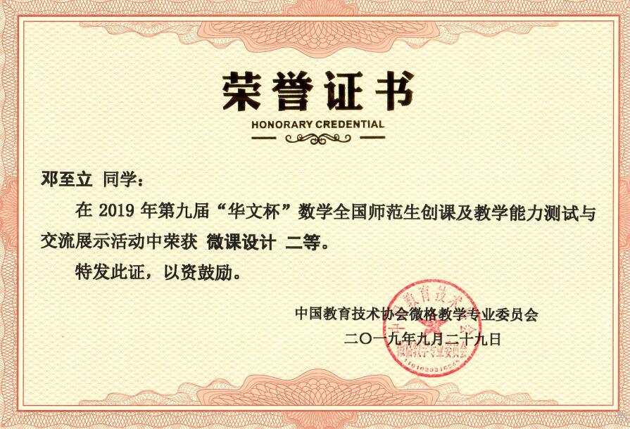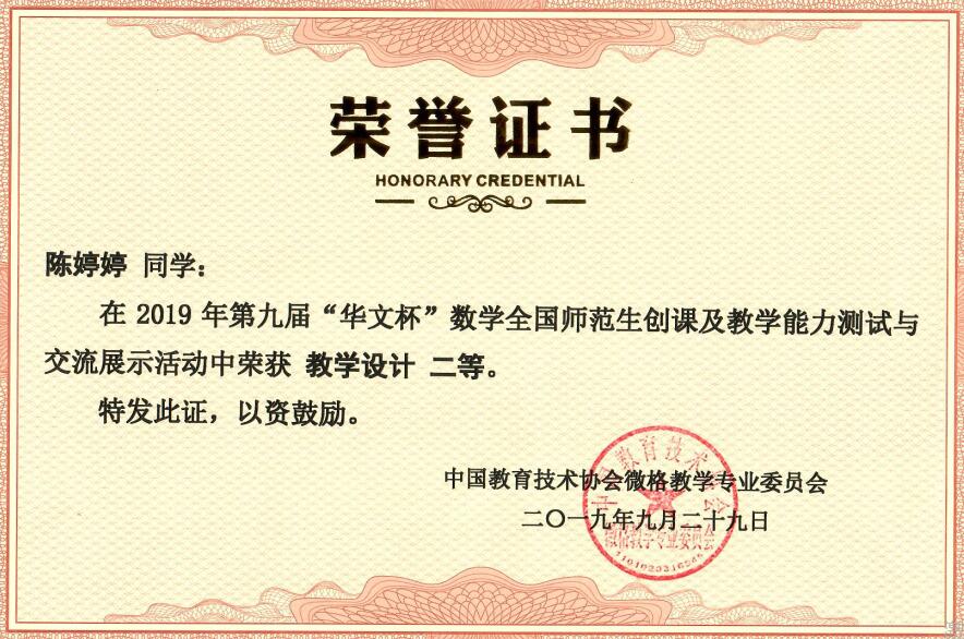 数据表明,此次大赛参评院校更多、活动规模更大、奖项设置有所调整,测试难度明显提升。437bwin必赢国际首次参与此次大赛,在屈勇老师的精心指导下,2017级小学教育两名本科专业员工通过测试前期精心设计教学方案,认真制作教学辅助课件,反复试讲,相互点评,并对教学设计、课件不断加以修改完善,测试中经过教学片段(文稿)设计、模拟授课、现场答辩等环节的检测,凭借良好的专业素质和突出的现场表现,在强手如云的激烈竞争中最终取得了优异成绩。其中数学创课设计类,邓至立荣获创课设计二等奖、创课展示二等奖;微格教学类,陈婷婷荣获微格设计二等奖、微格展示三等奖。