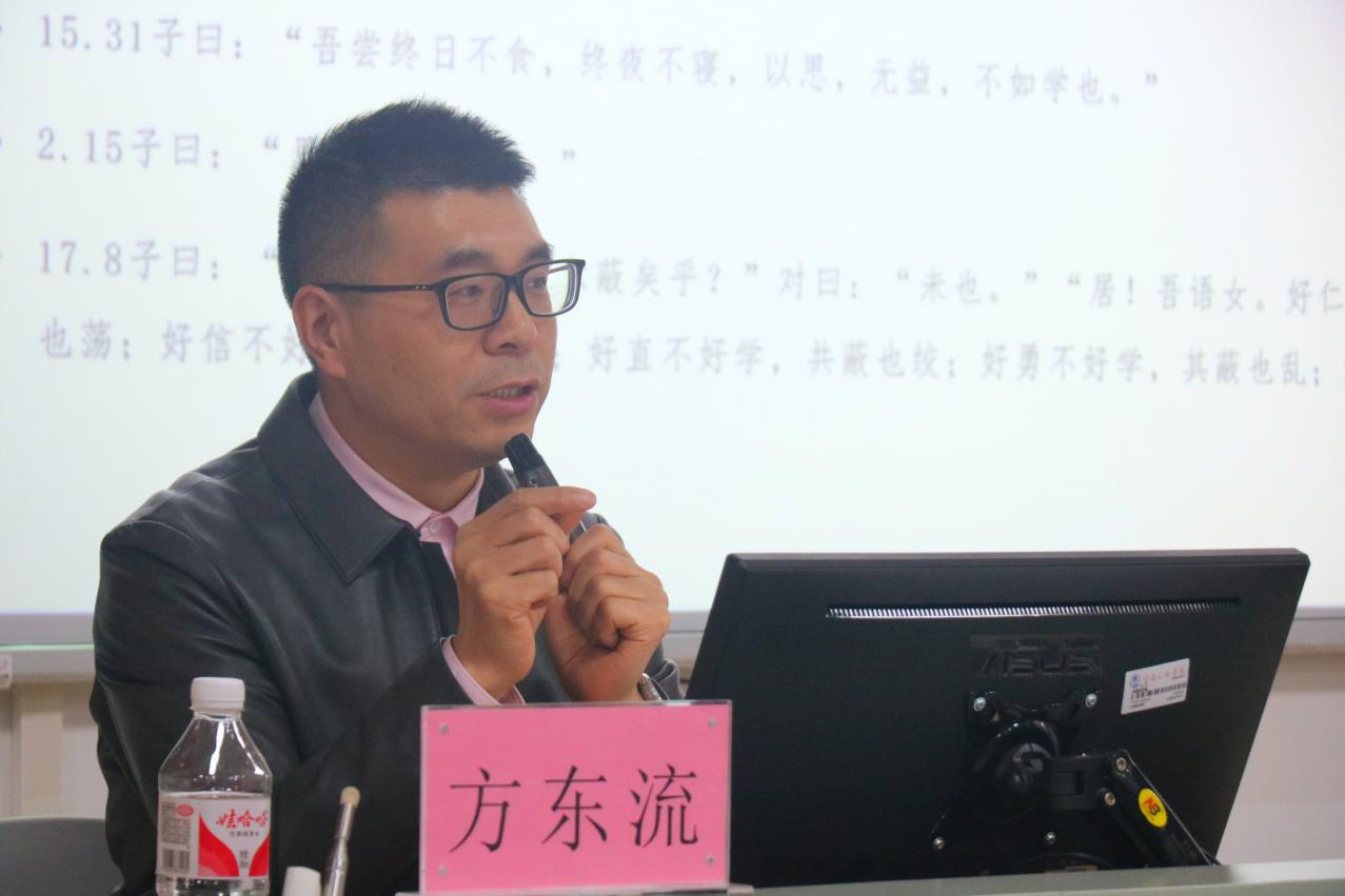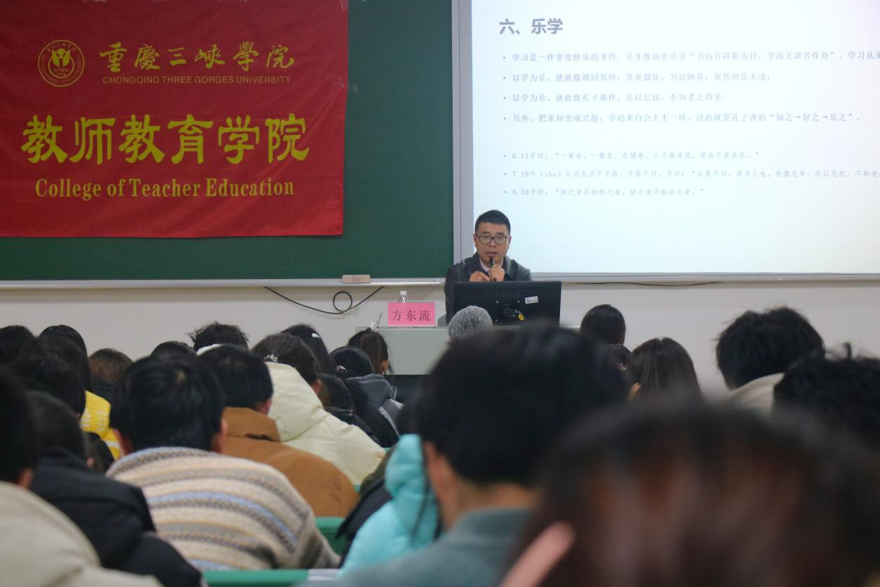 2024年12月26日下午2点,437bwin必赢国际于博学楼1栋201成功举办了一场以“读《论语》,悟学习之道”为主题的学术讲座。本次讲座由重庆树人教育研究院中学研发主任、重庆国学学会常务理事、中国作家协会会员方东流老师为主讲,437bwin必赢国际副经理许刚主持,一百余名员工参与。